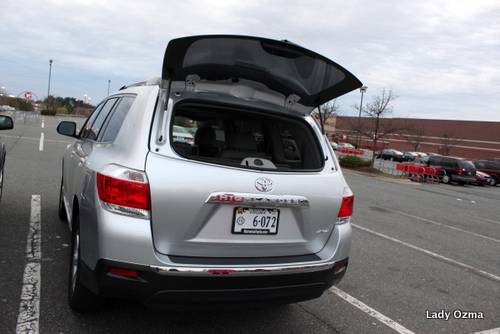 Now a busy gal might have her hands full of shopping and want some quick access to the trunk – and the Toyota Highlander offers that with the glass window opening to give you just that! Nice perk!