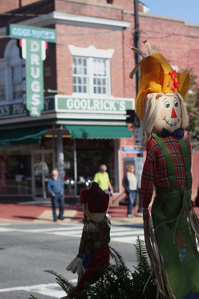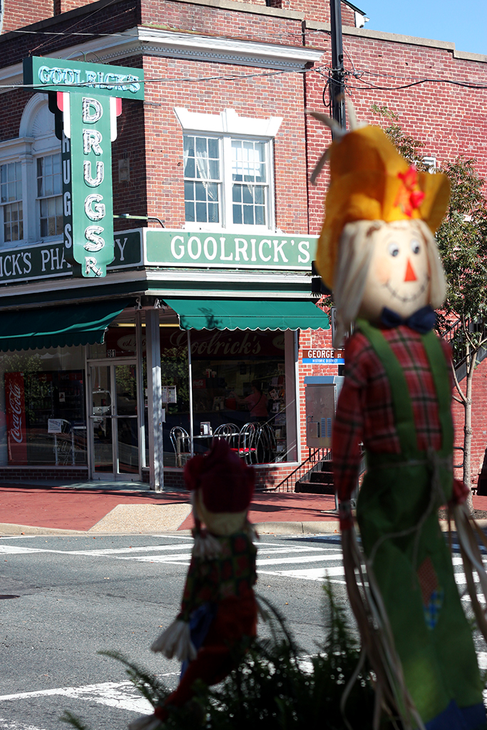 To feature something in the foreground, I used my 50 prime lens to capture this darling scarecrow standing across from Goolrick’s. Fredericksburg is decked out for the harvest, and I’m liking the decor! I like that where I stood I could capture him on the right third of the picture while the similarly vertical sign is in the left third and that the sunlight shines on Mr. Scarecrow’s face, illuminating him.