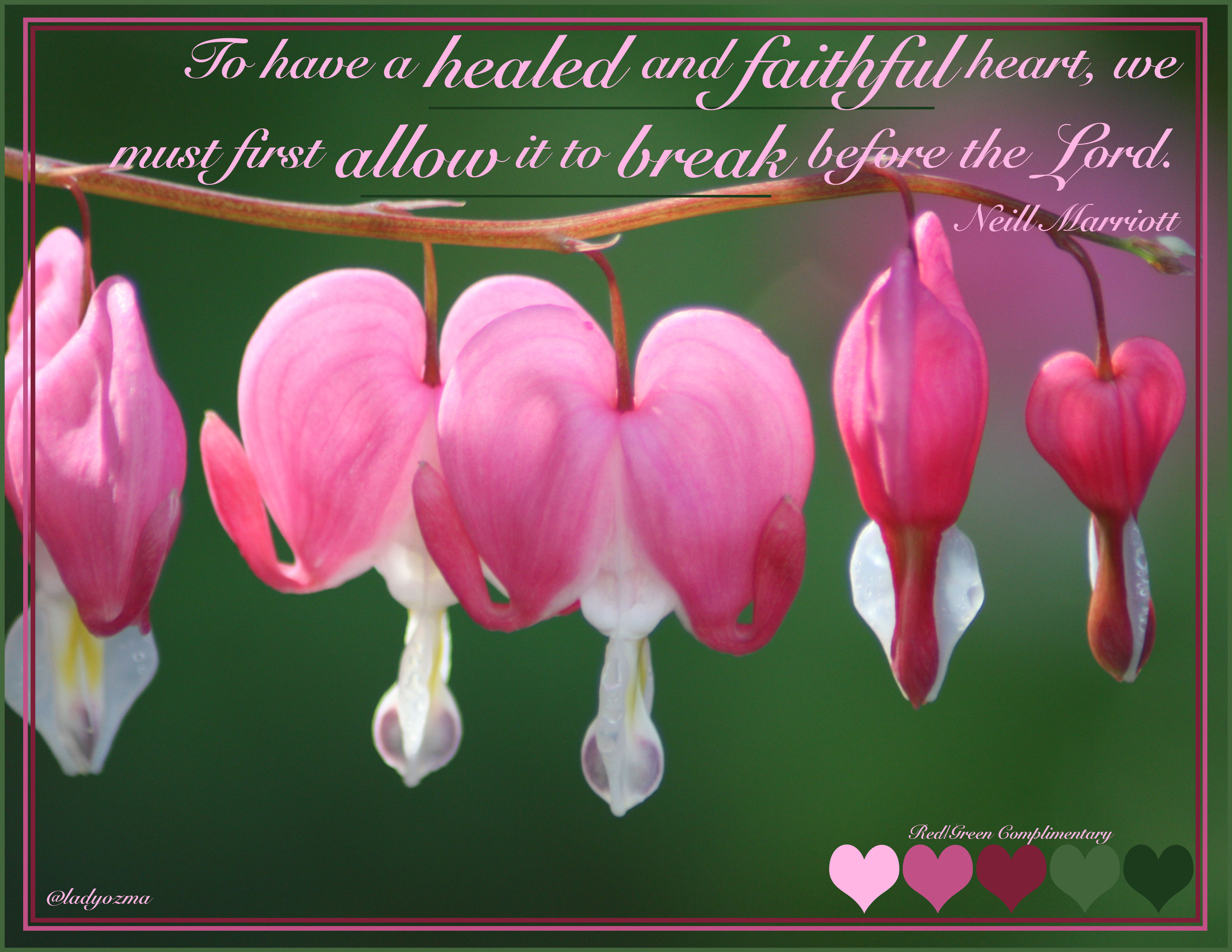 I love bleeding hearts.  They look broken, yet they are beautiful.  It’s their very brokenness that makes them what they are.  We can have our lives smashed into a thousand pieces, but we come back better and stronger for it. When we give up trying to be strong beyond our capabilities, we find true healing.  The message I wanted to convey was how allowing yourself the weakness of a broken heart can truly bring healing.  It feels ugly, but it’s one of the truest forms of beauty.