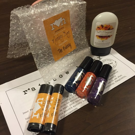 I picked up the October “Mystery Bag” from Rainbow Honey. I like that I can choose this one each month or subscribe. They also give the things away for free if you order a lot of product from them. I haven’t gone that far yet. The small Mystery Bag is great for me because it’s smaller sizes. I don’t really always need full size polish bottles. I don’t do my nails that much and I like having a variety. Less waste!